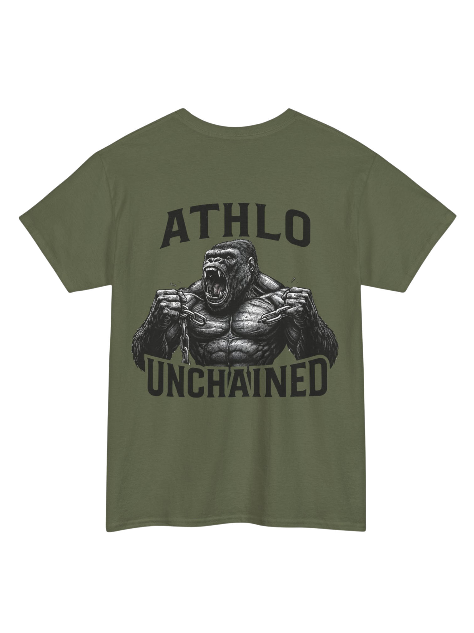 The Athlo Unchained T-Shirt captures pure, untamed strength. Featuring the roaring gorilla tearing through chains, it’s a bold statement of resilience and power — perfect for athletes who push past limits and never back down.